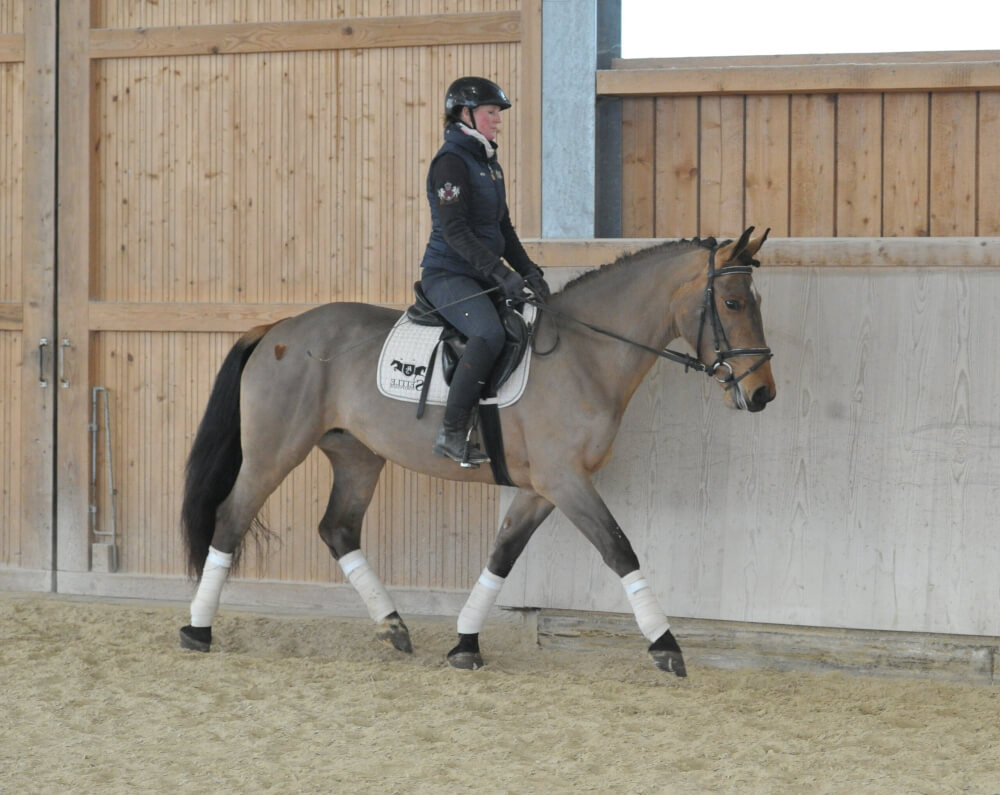 Kompakte, sehr sympathische braune Stute mit bester Allrounderqualität. Schon allein durch ihre liebenswerte und unkomplizierte Art, kann sie durch ihr Wesen punkten. Erst seit kurzem unter dem Sattel zeigt sie sich trotzdem ausgeglichen und nervenstark. Ihre Allrounder- und Reitqualitäten lassen ebenfalls keine Wünschen offen.